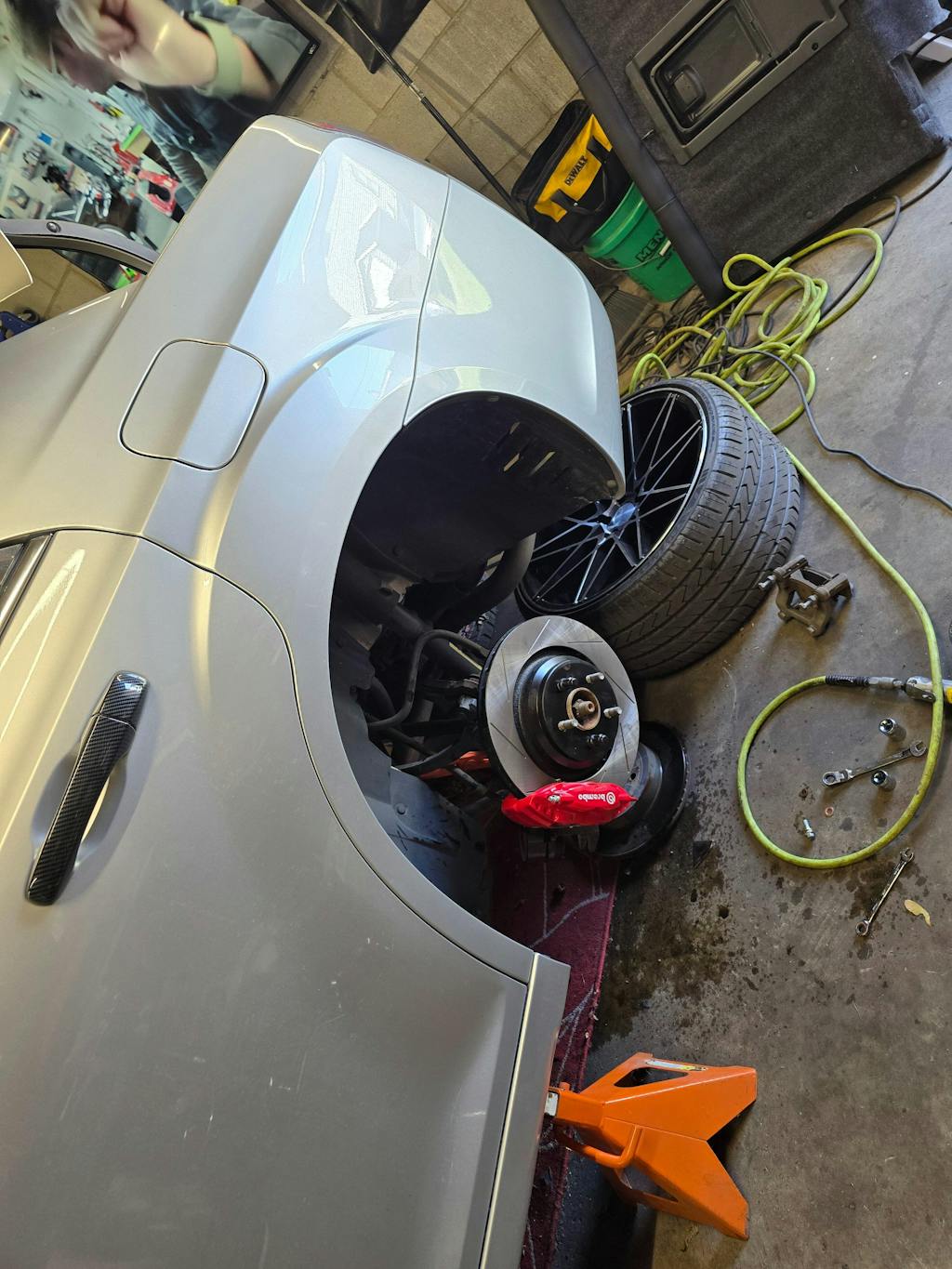 Well, we've got you! Our near bolt-on system is a system that allows you to use a Factory 4 Piston Rear Brembo Caliper from a 2006-2023 SRT, Scatpack, or Hellcat with fully functional E-brake.