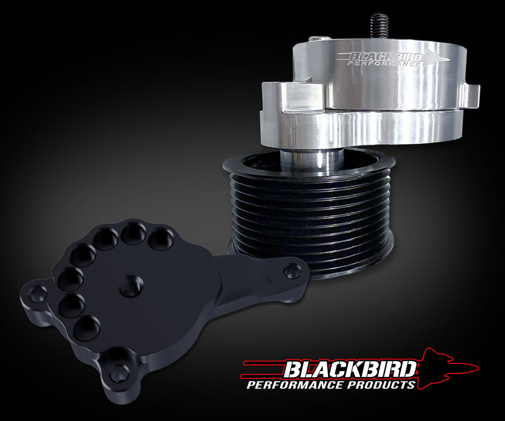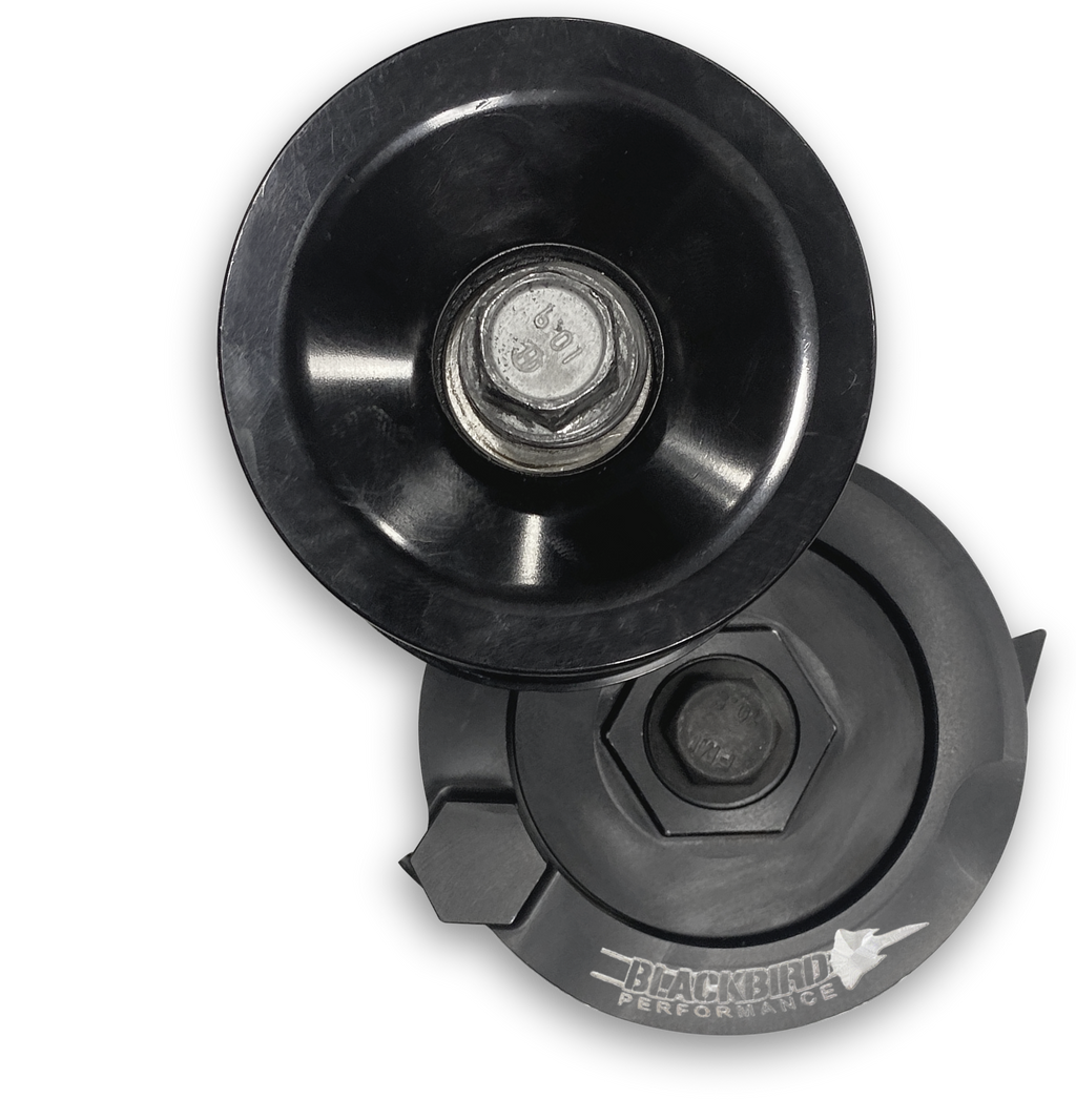 Our supercharger belt tensioner was developed to replace the factory style tensioners that have neither the strength, range of motion, tension and damping that is optimum or required to make supercharger belt drive systems function with minimal power robbing belt slippage and/or prevent belt/system failures. The tension and internal damping are carefully matched to provide smooth and continuous control even in extreme events such as two step / rev limiters and sudden and repeated drop throttle. The heavy duty and all billet construction combined with these less obvious, highly engineered features make this tensioner far superior to others, and with the included billet pulley of your choice (10 or 12 rib) are offered at a very high value price while being Made in the USA.