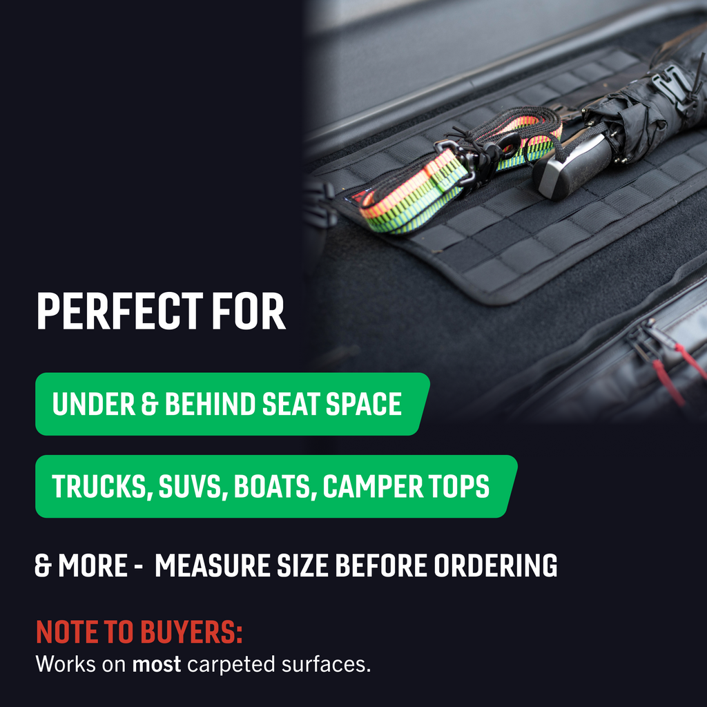 When your truck is your office, you need things to be organized. BuiltRight Tech Panels provide mounting locations for all kinds of pouches, clips, straps and gear and attach securely to any carpet surface that velcro will stick to. Spend less time thinking “where’d I put that?” and more time thinking about how you’re going to get the job done.