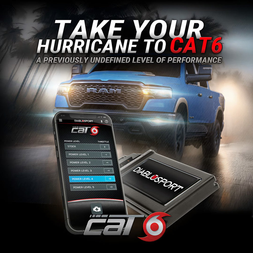 The DiabloSport Pulsar Cat6 is the most advanced performance module available for the new Hurricane SST engine family, delivering unmatched power and control through your smartphone. With gains of more than 60 rear-wheel horsepower, Pulsar Cat6 redefines what’s possible for the latest generation of turbocharged Ram engines. Using the free Cat6 mobile app, you can select from multiple power levels on the fly while also customizing throttle response to perfectly match your driving style—from smooth and steady to aggressive and responsive. The Cat6 app isn’t just about performance—it also provides complete insight into your engine. You can view and record live data, check emissions readiness, and read or clear Diagnostic Trouble Codes (DTCs) in real time, all from your phone. The new Hurricane platform has already proven itself as a worthy successor to the HEMI, with Standard Output models outperforming previous generations and High Output versions rivaling TRX-level acceleration. With a Pulsar Cat6 installed, an RHO can run door-to-door with a stock TRX, delivering an exhilarating driving experience backed by the biggest gains available for the Hurricane SST. For drivers who want serious horsepower, customizable throttle control, and smartphone-driven convenience, the Pulsar Cat6 is the ultimate upgrade.