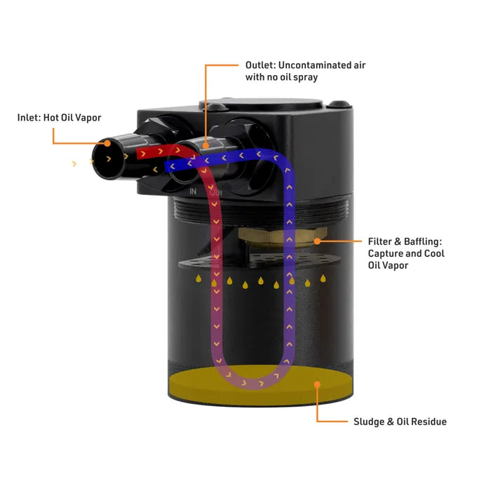 After installation, Mishimoto recommends checking the contents of the baffled catch cans every 1,000 miles until a baseline is established. Oil blow-by accumulation will vary with ambient temperatures and driving conditions. It is important that the contents of the can do not rise above the internal baffle.